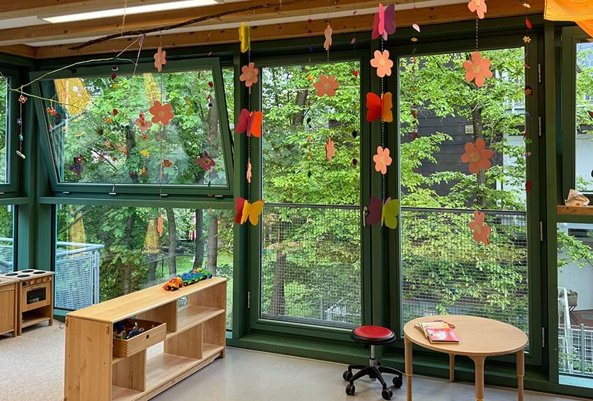Wir sind eine Kinderkrippe mit drei Gruppen in Milbertshofen, die hörende und KODA-Kinder (hörende Kinder von gehörlosen Eltern) aufnimmt.