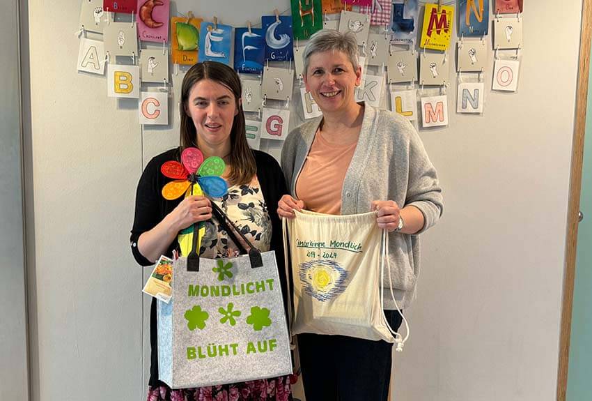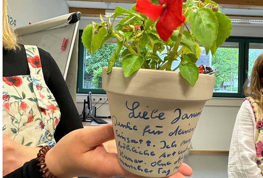 Leitung Stefanie Kraus freute sich riesig über die Aufmerksamkeiten von Kita-Kolleg*innen und Betriebsleitung: Ganz im Sinne unserer nachhaltigen Kita-Konzeption wurden viele Samen überreicht für die Hochbeete, die schon bald im großen Garten unserer bimodalen-bilingualen Kinderkrippe gemeinsam mit den Kindern bepflanzt, gepflegt und geerntet werden.
