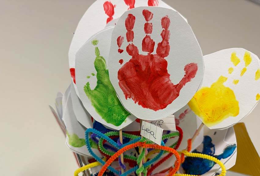 Anlässlich des Jubiläums sind Kinder, Eltern, Großeltern und unsere pädagogischen Fachkräfte zu einem fröhlichen Sommerfest zusammen gekommen. Nach den Ansprachen und einem tollen Gebärdenlied der Kinder gab es ganz besondere Spielaktionen wie Riechmemory oder einen Fühlpfad und natürlich leckere Snacks aus der nachhaltigen Mondlicht-Küche, am Morgen frisch zubereitet vom hoch engagierten Hauswirtschaftsteam. Auch die Deko war nachhaltig: Anstelle von Schnittblumen standen lauter bunte Papier-Hände in den Vasen.